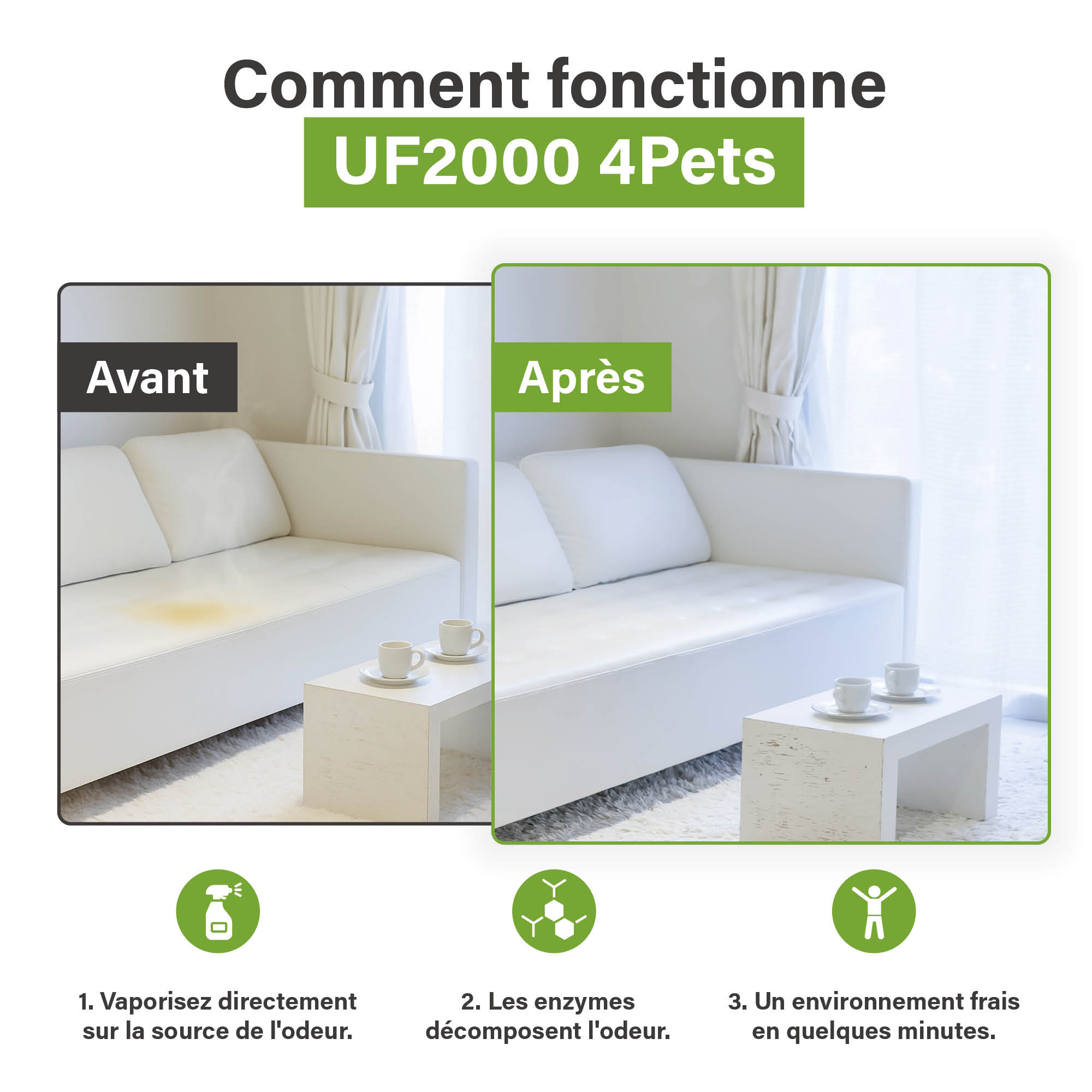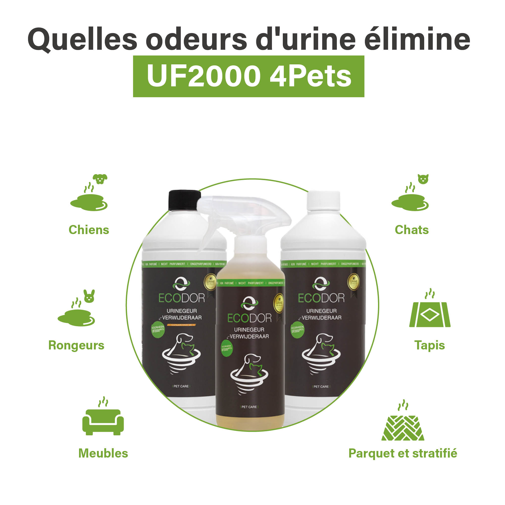 Ecodor UF2000 4Pets est le neutralisant d’odeurs le plus efficace sur le marché, spécialement développé pour éliminer les odeurs persistantes d’urine de chien, de chat et/ou de rongeur. Contrairement à d’autres “éliminateurs” d’odeurs d’urine, UF2000 4Pets ne masque pas l’odeur pénétrante de l’urine, mais l’élimine à l’aide d’enzymes végétales. Ces enzymes se lient aux molécules odorantes gênantes et les détruisent rapidement. Ainsi, l’odeur ne revient plus et vous ne sentez plus que de l’air frais!
