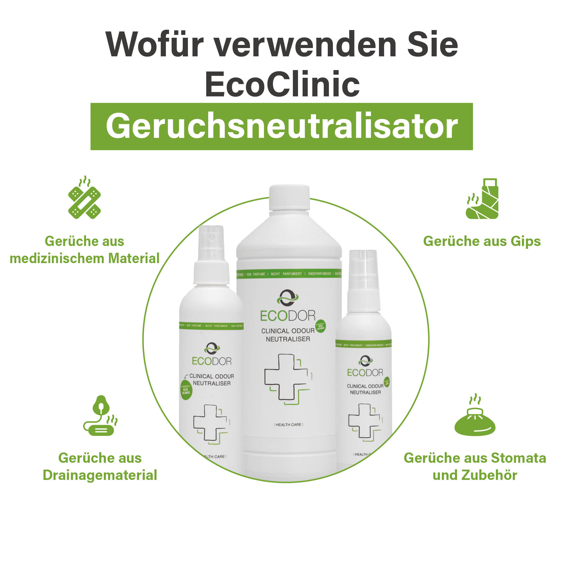 EcoClinic ist zu benutzen bei: Körpergerüche wie z.B. Schweißfüße, Verbänden und Wickeln, Wundbehandlung, Drainagemitteln, Emesis, Flatulenz, Inkontinenz, Stomaversorgung.