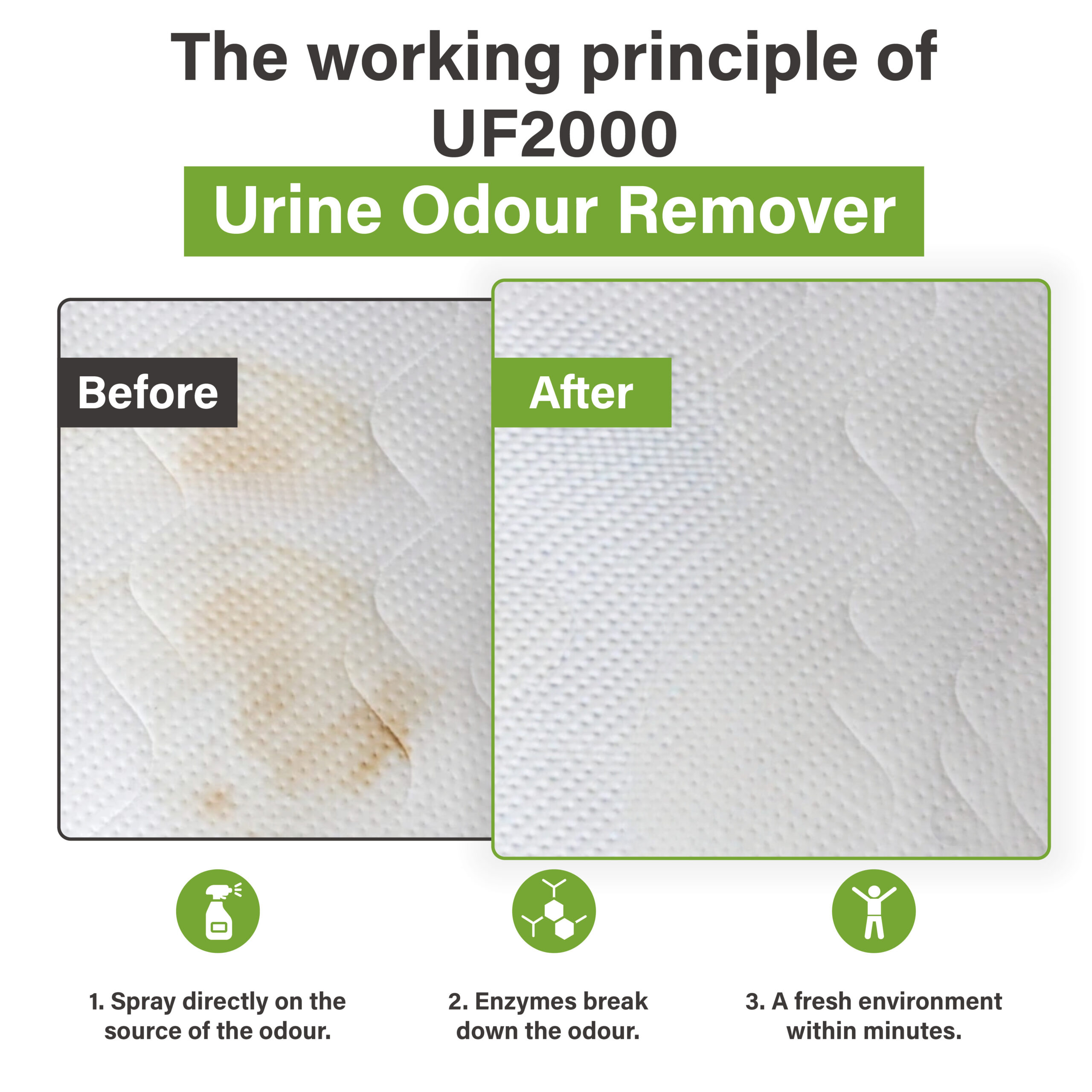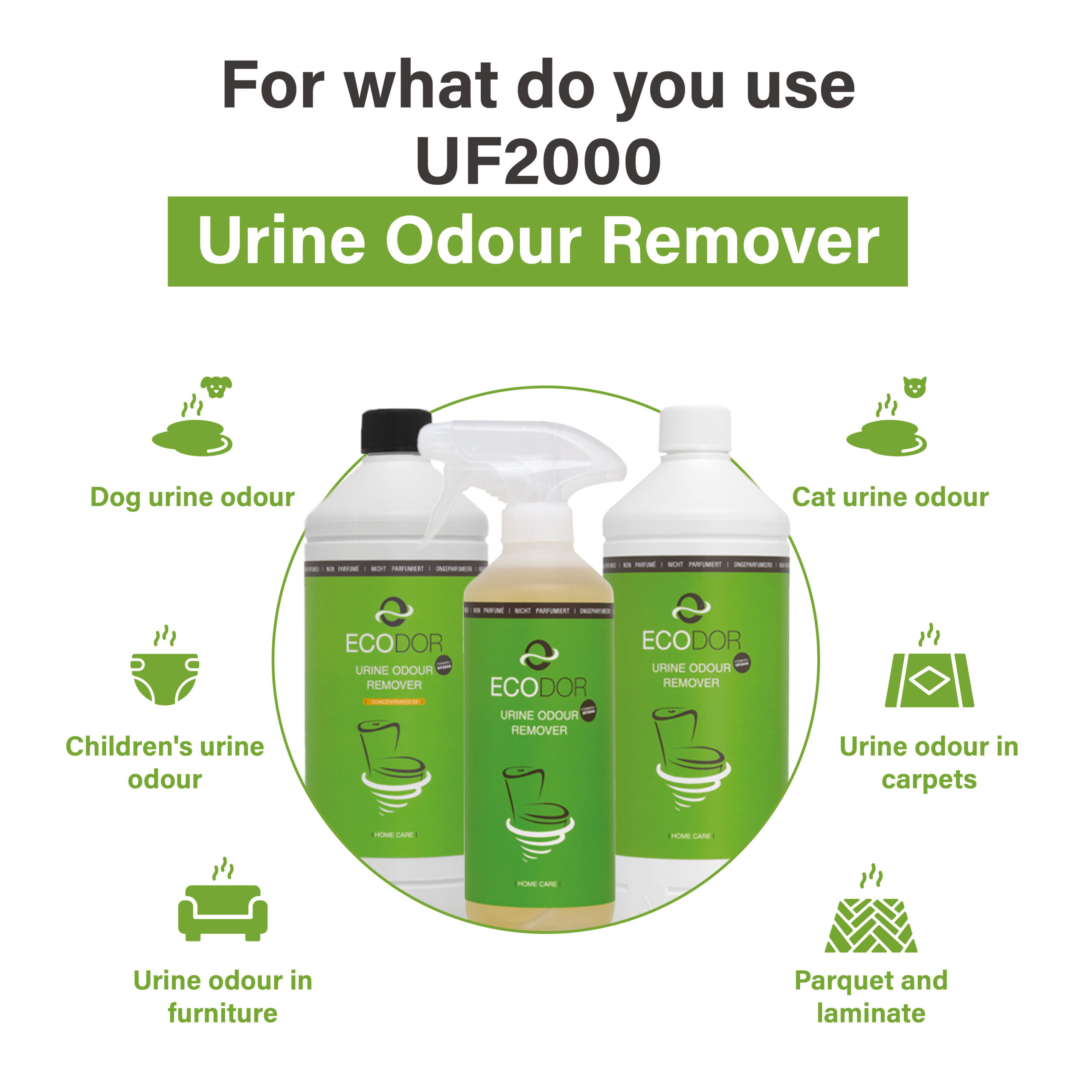 UF2000 against urine odor does not mask the smell of urine by adding extra perfumes, creating a mixed smell, but it destroys the penetrating smell with enzymes. UF2000 against urine odor is very efficient on hard surfaces (concrete, stone, walls, wood floors etc) but can also be used for rugs and carpets, mattresses, etc.