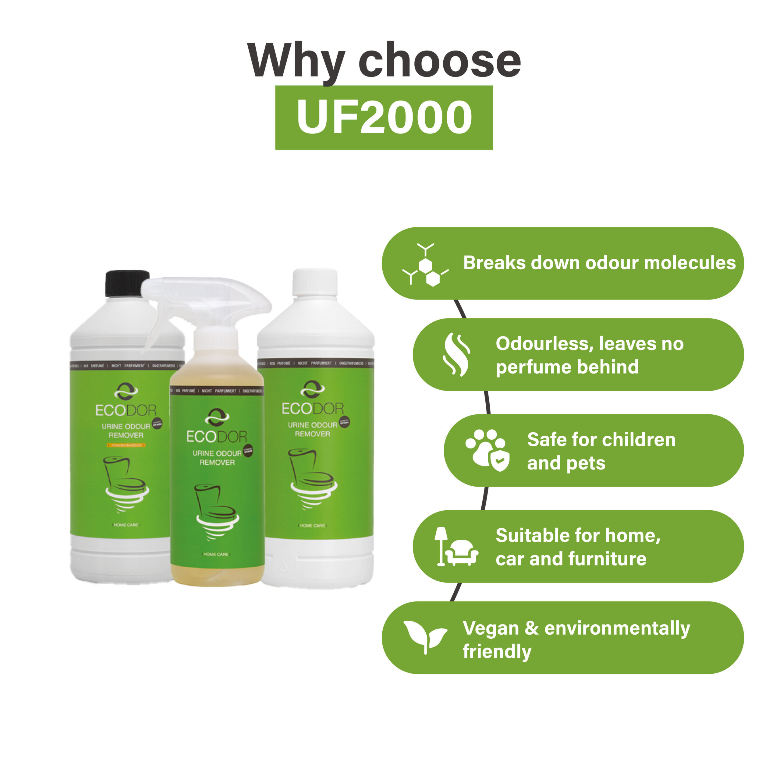 UF2000 is a powerful odour remover that effectively destroys the smell of urine. In places where the smell of urine is undesirable (for example in nursing homes or hospitals), UF2000 offers an environmentally friendly and effective solution.