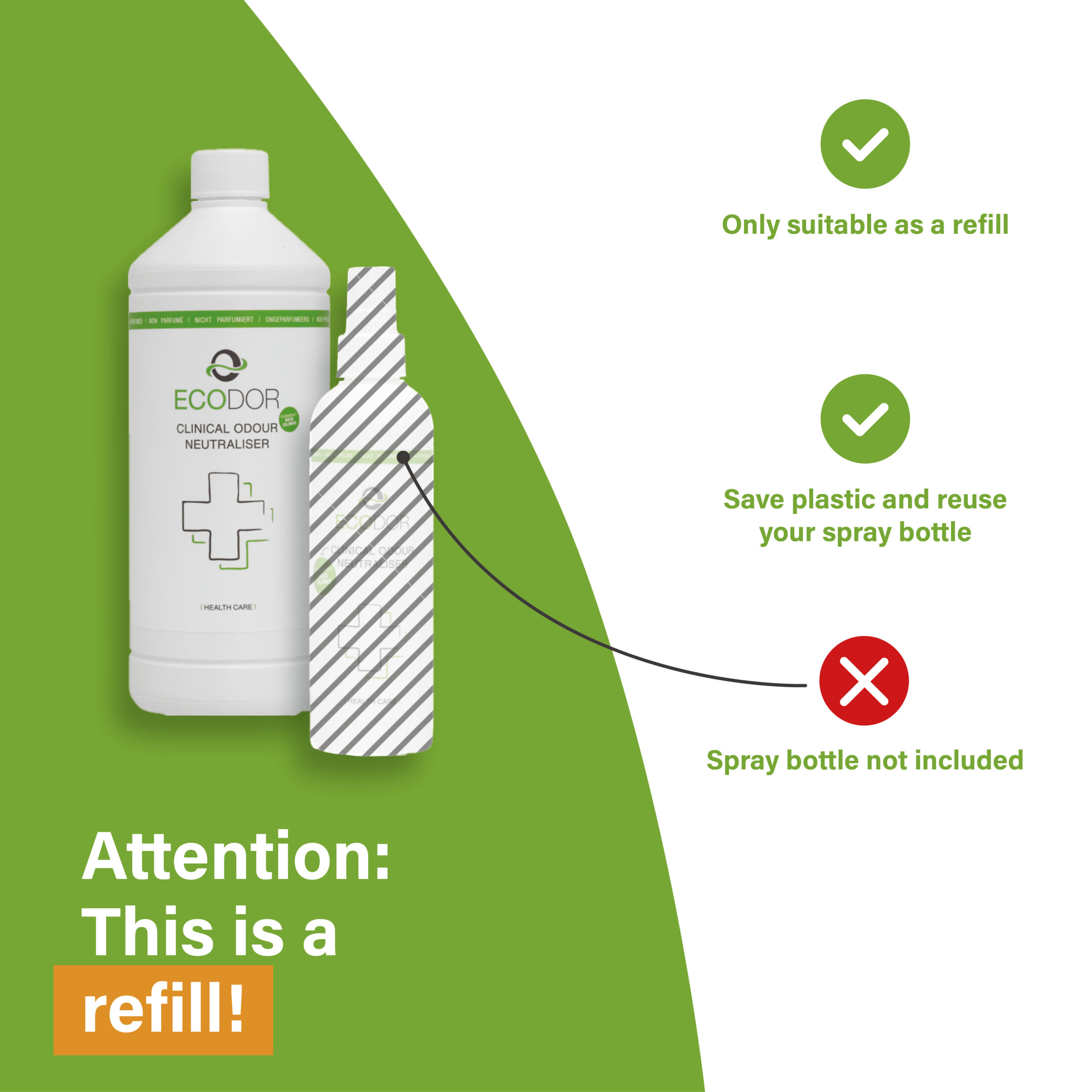 Economy size 1 liter refill bottle of EcoClinic deodoriser. To refill the bottle yourself.